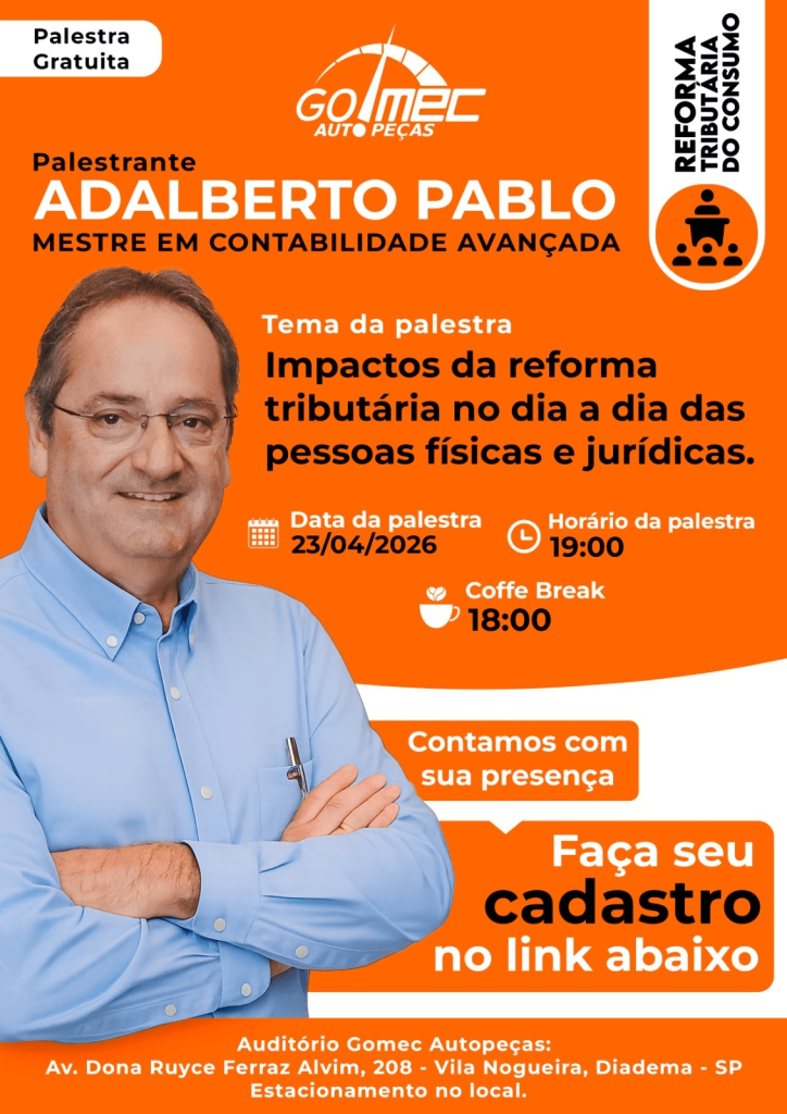 A empresa Go!Mec Autopeças promove, em Diadema, uma importante oportunidade para quem deseja entender melhor as mudanças econômicas do país. No dia 23 de abril de 2026, será realizada uma palestra gratuita sobre os impactos da reforma tributária, voltada tanto para pessoas físicas quanto jurídicas.