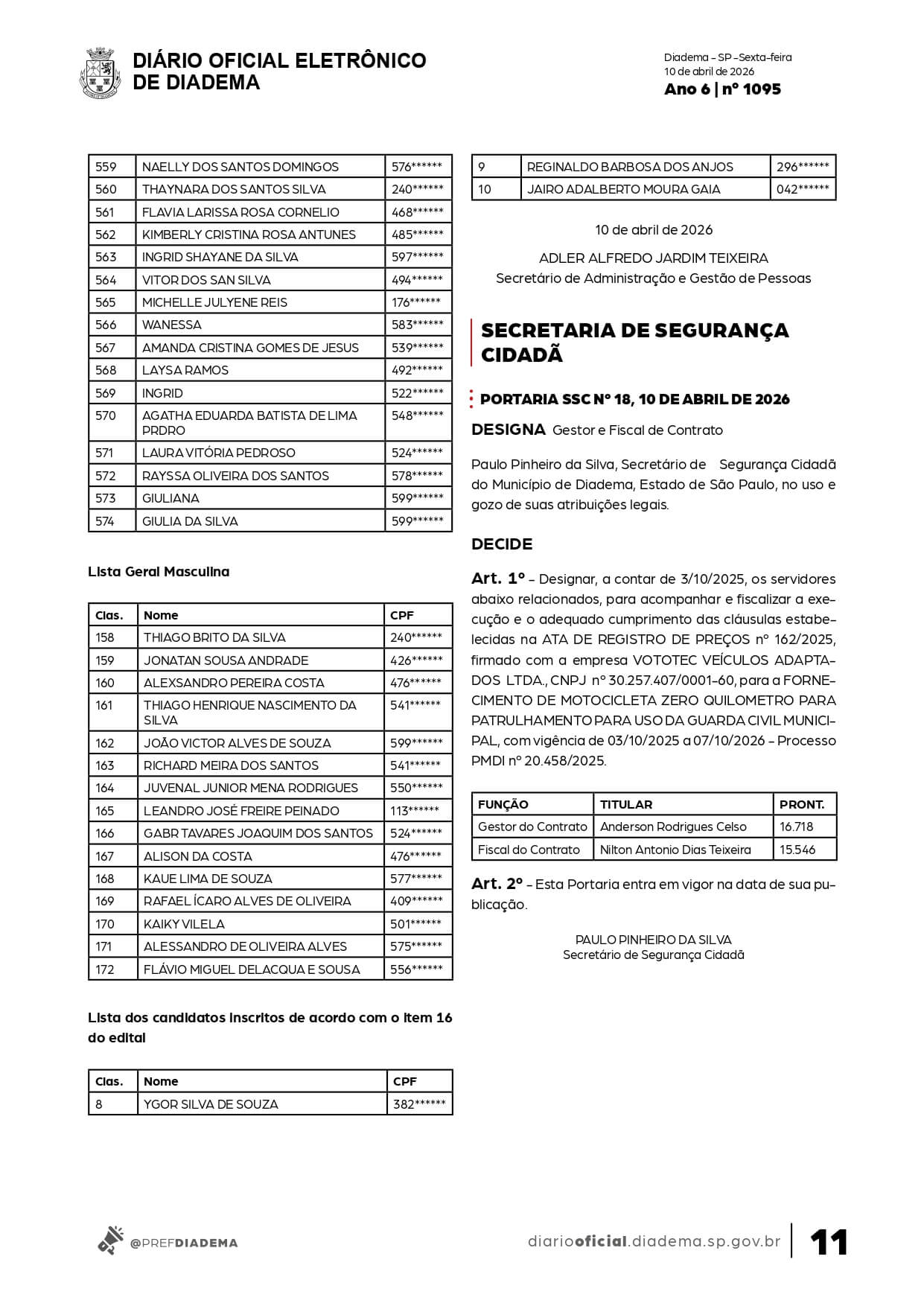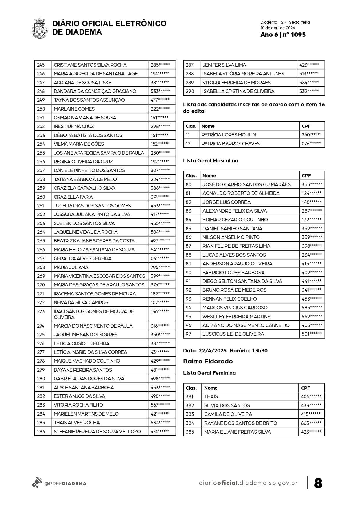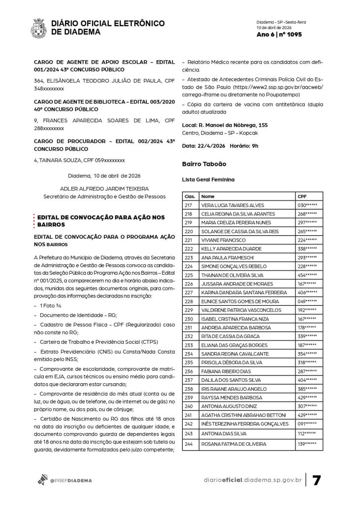 A Prefeitura de Diadema divulgou, no último dia 10 de abril de 2026, uma nova lista de convocação do Programa Ação nos Bairros, conforme publicação no Diário Oficial do Município .