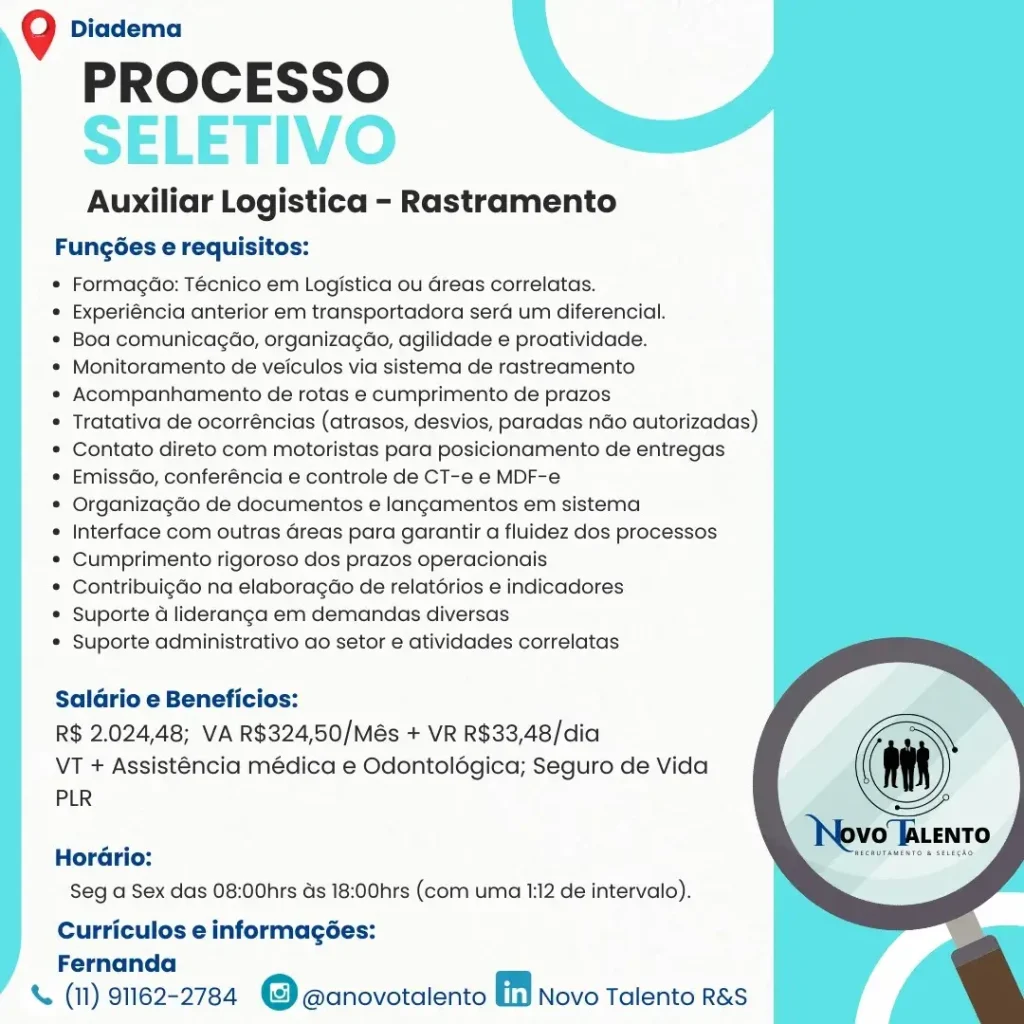 Está em busca de uma nova oportunidade de trabalho em Diadema? Uma empresa da cidade está com vaga aberta para Auxiliar de Logística na área de Rastreamento, com salário de R$ 2.024,48 e pacote completo de benefícios!