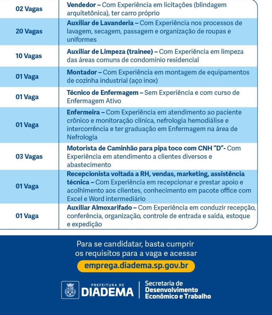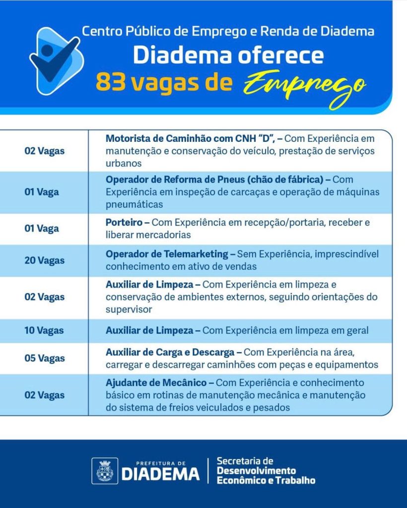 O Centro Público de Emprego e Renda de Diadema divulgou 83 vagas de trabalho por meio do programa Emprega Diadema, iniciativa da Prefeitura de Diadema, realizada pela Secretaria de Desenvolvimento Econômico e Trabalho.